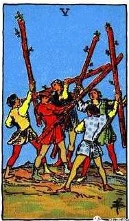 在綠草蔭蔭的山坡上,有五位充滿活力的年輕人,他們各自身穿不同顏色的衣服,手里揮舞著棍子,或許是在演習,比試,各自能力的展示。工作上一般都代表了當下,可能正處于一種各方競爭的狀態。愛情發展過程則有可能面臨著一種混亂的生活狀態。