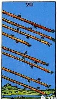 撲面而來的八根權杖,沖向同一個方向急速飛過,能量強大。感情中出現權杖八,雙方有可能一見鐘情,進展神速,但要注意激情來的快,也會去的快。工作上出現權杖八,快速有效的處理,積極主動。