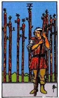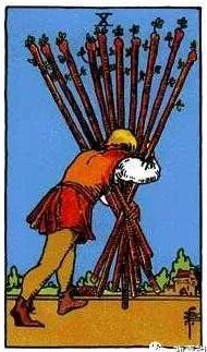 一個男人正奮力的抱著十根沉重的權杖,努力前行,雖然被壓得頭都抬不起,還是堅持著朝遠處的房子走去。前方有綠樹,房屋。代表著他要去的目的地,也代表歸宿和勝利。在工作中,權杖十象征著雖然有很大的壓力,但還是在努力 的堅持著。感情上,因為責任心,即使感到很疲憊,還是想朝著目標前行。