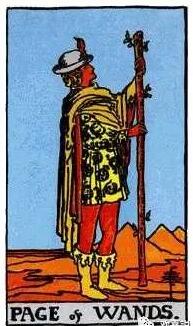 一位年輕人站在沙漠中,他的前方立著一根權杖,不過權杖是離地的。天空一片晴朗,遠處有三座金字塔,這是埃及的古文明國度。他是權杖隨從,要替王室公布政令。代表著一種信息的傳達。象征純潔的白色的帽子,上面插著的紅色羽毛,象征著他的簡單,代表著思考不夠成熟。