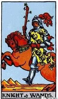 一個年輕人騎著一匹馬,手里舉著一根權杖。身上穿著的衣服有火蜥蜴圖案,它們的口和尾巴并沒有形成完全的閉環狀態。頭盔上的紅罌和身后更像有一團火焰正在燃燒,象征著強烈的勇氣和熱情。騎士的馬是紅色的,飛奔向前的姿勢,象征著勇往直前,但也有可能因為跑得過快,而馬失前蹄,造成有勇無謀的局面。
