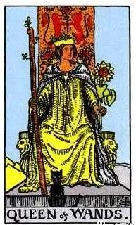 高高在上的女皇,戴著盛開的綠葉皇冠,穿著金黃色的服飾,很有權威的坐在有著獅子和向日葵雕刻的寶座上。她的雙腿是分開的,左手拿著火屬性的權杖,右手拿著向日葵。披著白色的披風,前面還有一張黑色的貓,是精靈與性感的象征。權杖皇后讓人感到充滿激情,火辣,而且有可能會自動出擊。