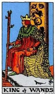 身穿橘紅色長袍子的國王,側著身子看向遠方,好像隨時準備出發的樣子。他手中拿著權杖。上面已經發出了枝芽。披風與他后面的王座背上,都布滿火蜥蜴圖騰。腳下還有一趴小蜥蜴。在事業上抽到這張牌,一般都代表了一種勝券在握,也會積極行動的樣子。愛情中抽到這張牌,則代表了對方可能是值得你信任,有能力的人。