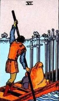 一名男子拄著黑色的長桿撐著一艘船。船上坐著一對母子,母親全身被黃色的披風罩著。船的一側是激流,另一側則非常平靜。船上競然還插著六把寶劍。象征傷害的的六把寶劍不能拔起,否則船會沉沒。代表著他們只能帶著危險前行。在情感中抽到這張牌代表了當下雖然身處低潮期,還是能得到其他人的關注和照顧還有支持。