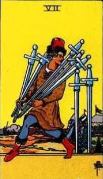 軍營里,一名男子趁著敵人沒有防備的時候,躡手躡腳地抱走了五把劍,而另外兩把在地上佇立著。身手是幾個蒙古包之類的帳棚,由棚帆繽紛的色彩和插在尖端上的旗幟,可想知,這是敵對的大軍即將壓境的場面。他好像知道一個人的力量是渺少的,所以只能以這種他自以為聰明的辦法,以為能削弱對手的戰斗能力。卻不知道沒有全部帶走的寶劍,反而會給他帶來更大的危險。寶劍七代表我們在做一件困難的事情,中有付出極大的努力,才有獲得成功的可能性。在堅持中這種鼠竊狗頭看似很聰明的行為,也許會一兩次成功,但未必就真的會一直成功。