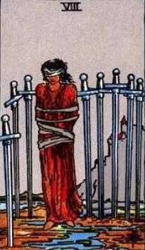 牌面中有八把寶劍插立在地面上,分布在紅衣女子的四周將她圍繞。她直挺挺地站著,不但被寶劍包圍,身上也被綑綁著,雙眼更被蒙起來。她的右腳踏在土地上,而左腳踩在水中,和節制牌有點相像,同樣都是觸探到意識和潛意識,跨越現實和精神的領域。腳下一片紅色的泥濘,從遠方流到這里的水,把低洼處填注。女子背后其實就是溫暖家園,她的雙腳其實是可以自由的離開的,只是她自己卻不愿意離開。在實際的生活當中,我們也常常這樣,以為是自己深陷困境,其實只是我們自己把自己困在其中也不自知。