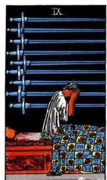牌面中坐在床上的女子,雙手捂臉,像是在忍受極大的壓力和痛苦。他的頭上懸掛著九把寶劍,都緊密地上下橫向排列,劍尖指向右側。其中較低的幾把穿透她的上半身甚至是心臟,使得她頭痛驚醒。她的下半身蓋著棉被,上面是黃綠相間的格子,黃底格子中有紅色花紋,上面有黃道十二星座和十大行星的星象符號。這些星象的排列錯置而紛亂。寶劍九代表在現實生活中有可能會,隨時向我們襲來的意外。和寶劍三所代表的外在傷害不同的是,寶劍九所更多則是來源于精神上的一種折磨和痛苦。有時候暗指疾病、災難等內心造成傷害的一些偶然事故。