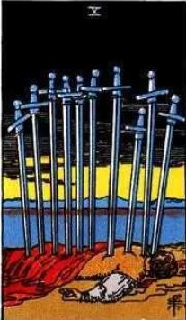 穿著紅袍的男子俯臥在地上,背上插著十把劍。十把劍都插在背脊上,排列整齊 ,所刺之處都是要害。寶劍十非常負面,代表著慘痛、非常的難受。它象征一切事物往不好的方向發展所造成的局面。但是男人披著的紅袍,也象征著他對生命的熱愛和不想放棄。遠方露出的魚肚白則在告訴人們,黑暗馬上要過去,黎明即將到來。