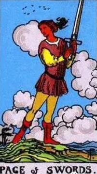 牌面中的侍衛,手握一把寶劍,他望向前方,頭發和背景中的樹都被風吹得飛揚。代表著一種發散思維的形象,喜歡觀察,但同樣的警覺性特別高。呈現出一種守衛,守護的狀態。