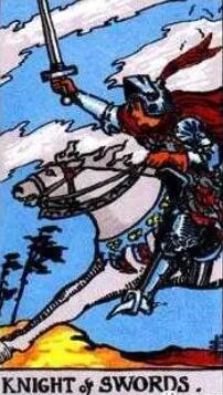 騎士騎著白馬在狂風中持續奔馳,手中高舉著一把,表情猙獰的往前沖,爆發力十足的形象。身邊吹起陣陣強風,混亂的云朵、失去秩序的飛鳥、及被吹斜的大樹、場面混亂。在事業中抽到這張牌代表著沖在積極的行動中。在感情中抽到這張牌,則可能會因為過快的發展,而導致情感溫度的極劇消耗。