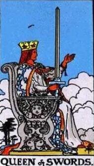 坐在寶座上的女子面貌冷峻,她的臉朝右方,右手直舉著劍。左手伸出并做著拒絕的手勢,她頭戴著金黃王冠,身穿白色的袍服,披風是著藍底云朵樣式的。寶座椅背的頂端向后卷,扶手的一側有一個天使頭相,椅腳雕飾著蝴蝶。通常,寶劍皇后通常代表著一位具備 理性思考,邏輯清晰的人。