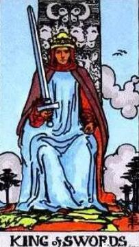國王頭戴金色王冠,紅色帽罩,身著淡藍的王袍和寶藍披肩。坐在灰色的王座上,座椅沒有扶手,卻有著高高的椅背,上面刻著白色蝴蝶的標記。遠方有樹木,以及遼闊天空中的云朵和飛鳥。寶劍國王的理性更重于精神和理念的層面。