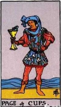 平坦的空地上,衣著華麗的年輕人。他的頭上帶著藍色的帽子,左手叉腰低頭看著圣杯里的魚,似乎在進行著愉快的交流,他的身后是起伏的海浪。侍者是風,風的本質是思考,圣杯是水,代表情緒與感受,所以圣杯侍從的思緒不斷的在影響他的情緒與感受。
