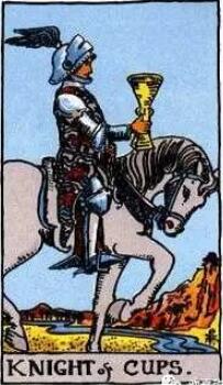 在湖泊前,全副武裝的騎士騎在白色馬上,他的左手握著韁繩,右手則握著一只金色的圣杯。停在一條湖泊的前面。圣杯騎士代表著自己正面臨著某種選擇,在思考著是否需要停下來等待,或者主動去追求。