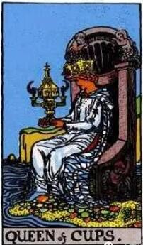 牌面中的金發女子姿態優雅,面容祥和。她頭戴金色的冠冕,坐在陸地上的寶座上,溫柔的注視著,雙手捧著的精美圣杯。河水從她的腳邊緩緩流過。圣杯皇后暗示著自己能相當有效的掌握著自己的情感,感受,情緒等內心的力量?;蛘呤悄鼙容^感性的思考或去行事,不是很理性。