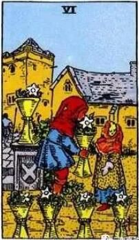 牌面中有兩個小孩,男孩正將他所栽種的花分享給小女孩。圣杯六所表達的是對兒時家鄉的一種回憶,兩小無猜,純真美好。前左前侍衛守護道路,暗示了并不想有人來打擾這段回憶。在兩性關系當中,代表著雙方之間擁有著純真的情感和簡單的快樂。圣杯六代表著一段溫暖,安全,穩定的關系。