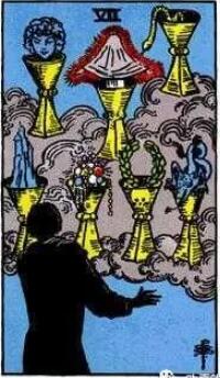 牌面中有七個圣杯漂浮在云霧繚繞的半空中,杯中分別裝著龍代表著恐懼或者是誘惑、桂冠代表著勝利,城堡象征著冒險、 珠寶象征著財富和物質的力量, 還有代表著智慧或者是嫉妒的蛇。桂冠的下方還有顆不顯眼的骷髏頭,代表著成功與死亡并存。有個人面對著這些圣杯,不知該如何選擇。圣杯七描繪的就是在追尋真正的身份。