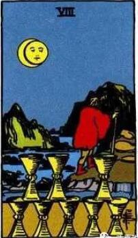 牌面中穿著紅色的衣服的人,拄著一根權杖從沼澤當中走向遠方。而他的身后是排列有序的八個圣杯。他的頭頂之上掛著滿月和半月。月下是怪石嶙峋,河流。遠處還有兩座小山。圣杯八的出現,往往代表著經過了仔細的考慮之后,而付出的某種行動。