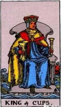 洶涌的海面中央,國王鎮定自若的坐在王座上,象征權力的杖,右手持圣杯。有一條躍出海面的魚。身后有一條紅色的船。圣杯國王緊抓著一只圣杯,暗示著圣杯國王能控制自己的情緒。