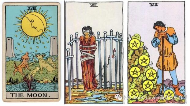 月亮牌指出眉心輪和/或臍輪,可能是創造力爆發,也可能是情緒混亂,而寶劍8則代表受困(可能是想不開),而錢幣7可以代表現實的一些擔憂和煩惱,比如我(錢幣7)最近在憂愁考試結果怎么還沒出,然后我感覺悶悶不樂,做啥也沒心思,即使考完了也不能放松一下,因此我那壓抑的神經(寶劍8)似乎想要爆發了(月亮),因此我最近晚上都睡不好,所以眉心輪和臍輪的能量可能有些過度活躍,從元素方面來說,水風中立,但是寶劍8的受困和迷茫會加強月亮牌的混亂不安,而土加強水的力量,因此水元素的力量最強。