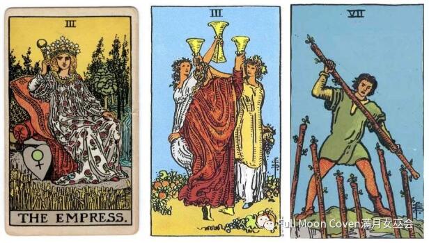 皇后牌代表海底輪和/或心輪,而水土互相支持,因此在社交、聚會、和他人相處的時候,海底輪和心輪的力量得到加強,有更多的快樂和滿足,同時和親人朋友關系更融洽,但是我加了一張比較沖突的權杖7,因此皇后或許人際關系處理得不錯,但是另一面卻需要努力維持工作,與競爭對手較量,而火削弱了水的力量,可能讓皇后的社交時間變少了,因此可以理解為在工作壓力之下,海底輪和心輪有逐漸失衡的趨勢,需要抽出時間休息、接近大自然可以平衡,因為牌中有兩個陰性元素,所以也不會太失衡